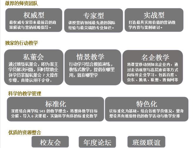 北清智库商学院“2018级MBA首席营销官”课程旨在让学员掌握营销的理论基石,了解营销管理的分析框架,结合互联网思维形成新形势下正确的营销理念,能够在今后的商业运作系统、科学地构建营销管理的每个环节。