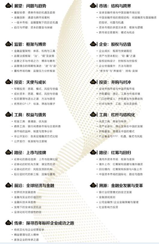 13大独创模块构筑起有逻辑的金融体系、40个精选案例打造岀有深度的资本框架。每期班不超过60人,配备3名核心导师构筑一个纯粹以金融为内容的课堂。